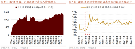 “新国九条”颁布后,政策内容逐步落实,1)北向资金、保险等增量资金加速入场;2)直接融资比重迅速增长;3)并购重组规模扩大。“新国九条”提到要“壮大专业机构投资者”、“扩大资本市场开放”。作为配套落地政策之一,当年四季度沪港通股票开始交易,海外增量资金开始入市,从数据上来看,沪股通开通后仅3个月,累计净买入资金就近1000亿人民币,也正是在这一年,保监会发布《中国保监会关于保险资金投资创业板上市公司股票等有关问题的通知》,放行保险资金投资创业板股票,保险资金权益投资范围进一步扩大,投资于证券市场的保险资金占保险资金运用余额的比例一路攀升,从当年6月的9.37%,一度攀升至2015年5月的16.06%,成为历史高点。增量资金的加速流入为2015年的大牛市奠基了坚实的基础。
