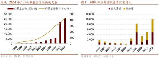 从政策的有效性来看,国九条实施后,直接融资比重开始逐步提高,公募基金快速发展,再融资占股票募集资金的比重快速攀升。具体来看,《基金法》正式实施后,公募基金迎来了快速发展的通道。2004年发行基金产品162只,募集份额为3137亿份,是前三年的募集份额的总和。《上市公司证券发行管理办法》发布后,再融资比例也大幅扩大。国九条的政策目标基本落实,为后续2007年开始的大牛市奠定了基础。