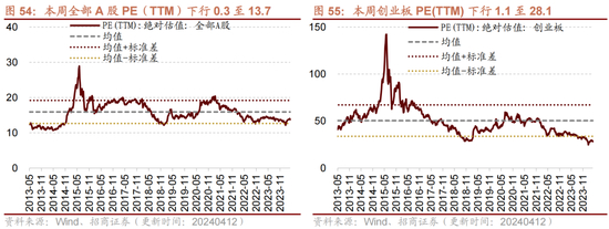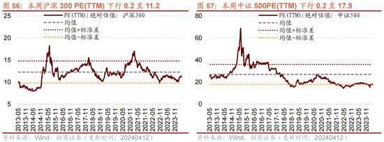 本周全部A股估值水平较上周下行。截至4月12日收盘,全部A股PE(TTM)为13.7,处于历史估值水平的29.5%分位数。创业板PE(TTM)下行1.1至28.1,处于历史估值水平的0.6%分位数。代表大盘股的沪深300指数PE(TTM)下行0.2至11.2,处于历史估值水平的34.4%分位数。代表中小盘股的中证500指数PE(TTM)下行0.2至17.9,处于历史估值水平的13.1%分位数。