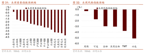 本周A股主要指数普遍下跌。主要指数中,小盘价值、上证指数和中证500表现较好,分别下跌0.35%,1.62%和1.81%;大盘成长、消费龙头、创业板指表现较差,分别下跌3.77%、3.86%和4.21%。