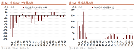 从资金需求来看,重要股东由净减持转为净增持,计划减持规模下降。本周重要股东二级市场增持45.5亿元,减持37.5亿元,净增持8.0亿元,由净减持转为净增持。其中,净增持规模较高的行业包括银行、电力设备、社会服务等;净减持规模较高的行业包括非银金融、汽车、机械设备等。本周公告的计划减持规模为30.9亿元,较前期下降。