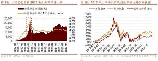 2015年上半年,杠杆资金推动股市达到了牛市。融资融券余额在6月达到了历史的峰值2万亿元,占A股总市值的比例高达3.62%。在这样的背景下,市场持续上升,以暴风科技为代表的新股首当其冲。3月24日上市之后连续34个涨停,至6月30日涨幅29倍,创业板涨幅前十名有九只个股是2015年上半年上市的新股。
