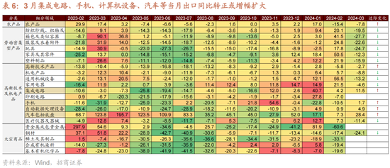 另一方面,3月高新技术产品部分出口改善,集成电路、手机、计算机设备、汽车等当月出口同比转正或增幅扩大。3月份高新技术产品出口同比降幅收窄至-2.7%,机电产品出口同比下降8.8%;通用机械出口同比转负至-13.2%,家用电器单月出口金额同比由正转负至-4.6%。集成电路单月出口金额同比继续改善,增幅扩大至11.5%,手机出口同比改善明显,单月同比由此前的-10.5%转正至1.7%,汽车(包括底盘)出口同比增幅扩大至28.4%的较高增速。