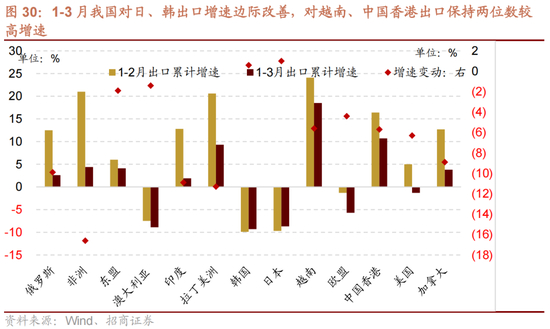 综合以上,在去年较高基数和2月出口增速较高的背景下,3月出口增速低于市场预期,但我们综合高基数、出口实际金额和整个一季度的表现来看,3月份的出口增速并不算低。国别地区方面,对美欧的出口仍然较弱,对日、韩出口增速边际改善,对越南、中国香港出口保持两位数较高增速,对新兴市场出口仍然保持韧性。细分行业中,高新技术产品、手机、汽车等仍然是主要增速拉动。考虑到3月全球PMI的改善以及海外库存周期的位置,预计出口仍有望保持改善趋势,汽车、家电、手机等出口优势产品仍值得关注。
