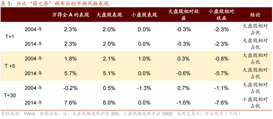 从市场风格演绎情况来看,前两次“国九条”颁布后,短期内,大盘风格相对占优。2004年、2014年“国九条”颁布后,T+1、T+5个交易日后,大盘风格相对小盘风格占优。但随着政策的边际影响递减,在T+30个交易日后,风格演绎会随当年市场情况发生变化。2004年,大盘风格占优;与之相反,2014年,小盘风格占优。
