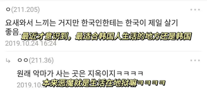 感慨韩国人还是最适合生活在韩国,理由是“恶魔就是生活在地狱嘛”。