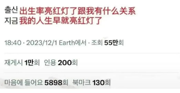 众所周知韩国的生育率连年走低,韩国年轻人对此的态度是:出生率亮红灯了和我有什么关系,我的人生早就亮红灯了。