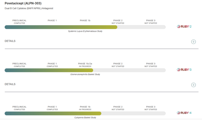 临床进度上,Alpine目前针对povetacicept的研发主要包括系统性红斑狼疮研究(RUBY-2)、肾小球肾炎研究(RUBY-3)、血细胞减少症(RUBY-4),其中RUBY-3进度较快,公司计划在2024H2开展IgA肾病三期注册性临床;同样系统性红斑狼疮研究的临床也较快,已经完成了一期临床。