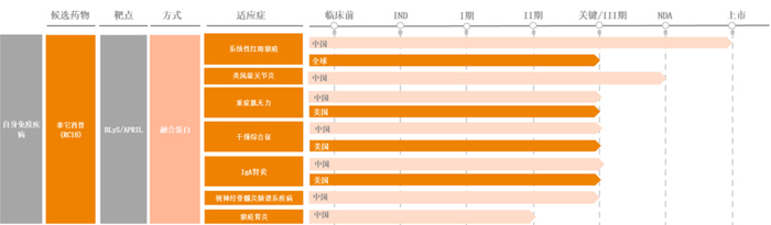从荣昌生物的泰它西普全球临床布局看,该药物在系统性红斑狼疮、重症肌无力、干燥综合征、IgA肾病这4大适应症在美国已经推进到了III期或关键性临床阶段,其中系统性红斑狼疮的三期临床进度最快,2022年6月已有首例患者入组。