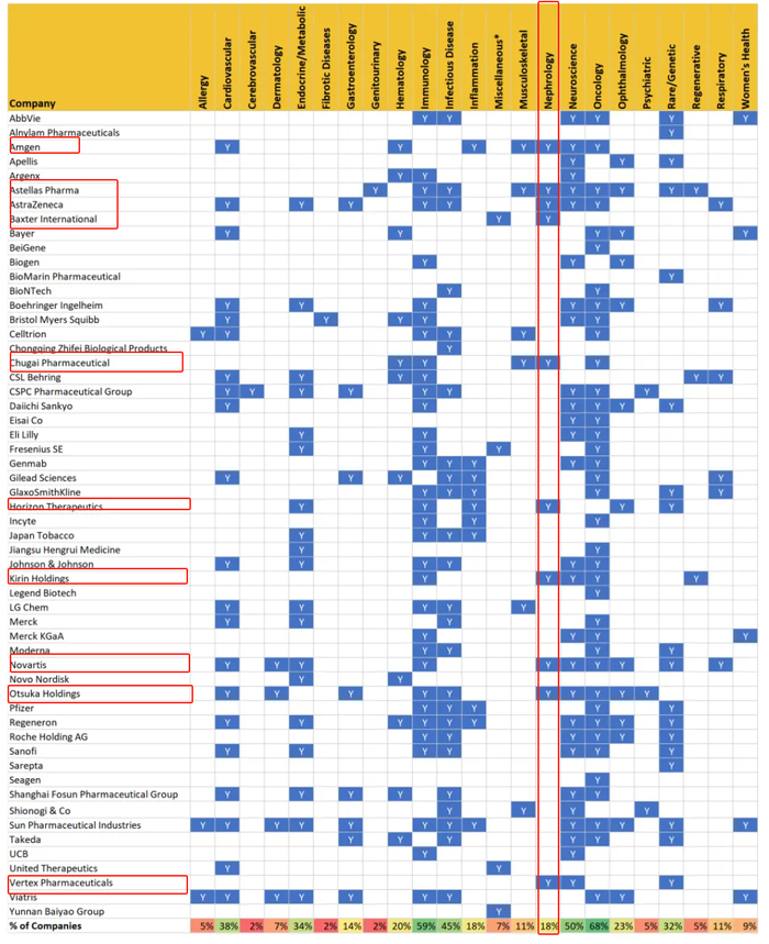 引自机车宝贝的56家药企BD方向统计,56家药企中有18%的企业对肾病方向感兴趣,其中当然不缺乏诺华、安进和福泰等公司的身影。