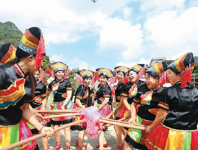 大新县恩城乡维新村武能屯里,身着民族服装的村民在舂糍粑。