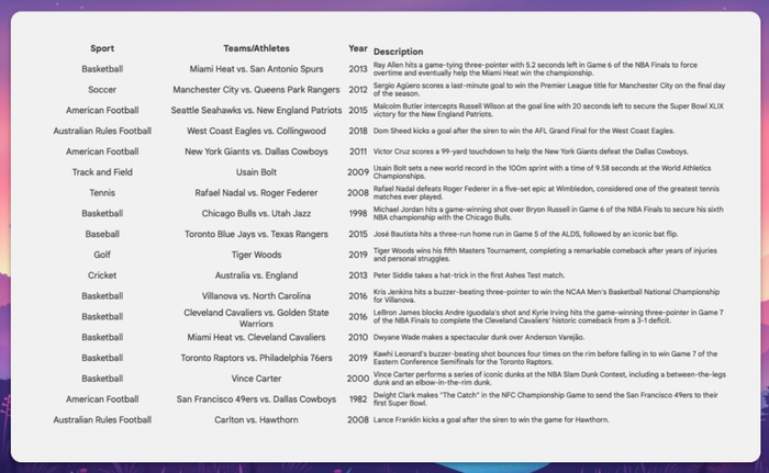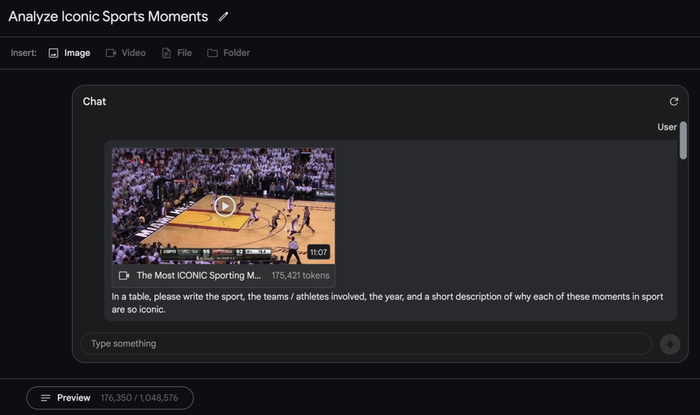 有网友给 Gemini 1.5 Pro 上传了一个有史以来最具标志性的体育时刻合集,并让它识别视频中的运动,参与的团队/运动员、年份等,它都能给你安排得明明白白。