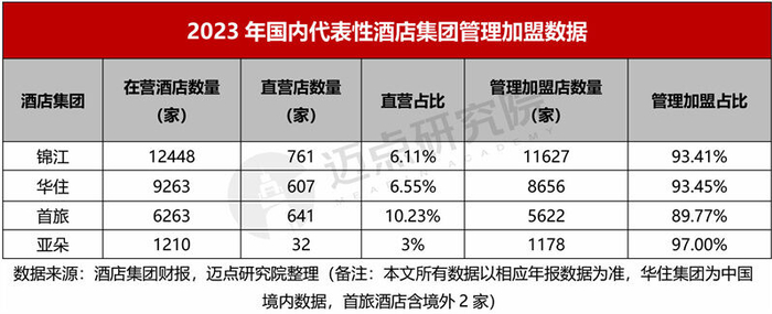 管理加盟情况:当前,国内连锁酒店集团以管理加盟模式为主导,锦江、华住、首旅、亚朵的管理加盟门店占比依次为93.41%、93.45%、89.77%、97%。进一步分析各集团管理加盟及相关服务收入:锦江酒店前期加盟服务收入、持续加盟及劳务派遣收入总计约47亿元,占其总营收的32%;华住集团管理加盟及特许经营酒店营收77亿元,占其总营收的约35%;据首旅酒店财报数据显示,酒店管理模式的收入占比24.93%;亚朵财报数据显示,2023全年其管理酒店收入为27.06亿元,同比增长98.8%,占比约59%。综上,管理加盟收入为上述四大连锁酒店集团营收的重要来源之一,占比约在25%-60%之间。