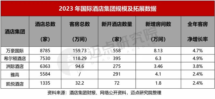 国际酒店集团拓展表现:2023年,各国际酒店集团持续加快全球扩张步伐,新店开业不断、酒店规模持续扩大,如截止2023年底,万豪国际酒店集团在营酒店8785家,酒店客房数约160万间。万豪、希尔顿、洲际、雅高、凯悦这5家酒店集团2023年度新增客房数均超万间,其中万豪、希尔顿这两家酒店集团客房净增长率约达5%。