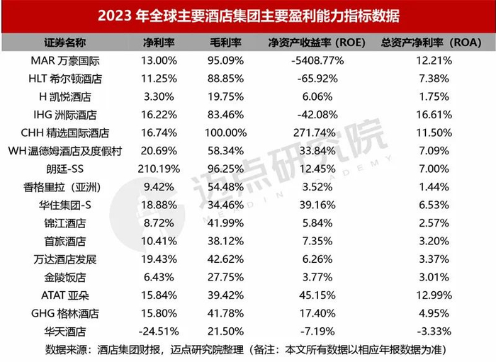 需要说明的是,科学合理评价一家企业的盈利能力、投资回报水平,不能只看单一指标,需要综合比较,如万豪国际虽然总资产收益率表现较好,但其净资产收益率极低,则需要引起投资者警惕。再如锦江酒店的毛利水平较高(毛利率41.99%),但其净利率不足10%(具体为8.72%),主要由于2023年度公司销售费用(同比增长42.44%)、财务费用(同比增长50.05%)等期间费用的增加导致净利偏低。