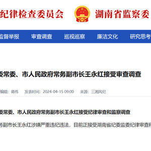 据湖南省纪委监委网站4月15日消息, 湖南省邵阳市委常委、市人民政府常务副市长王永红涉嫌严重违纪违法,目前正接受湖南省纪委监委纪律审查和监察调查。