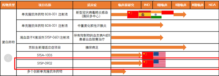 舒泰神同样开发了多款蛋白药物,包括重点单抗产品BDB-001以及凝血因子X激活剂STSP-0601等。STSP-0902是舒泰神正在开发的一款治疗用生物制品1类新药,据公开资料显示,该药物是一款蛋白药物,拟在中美两地进行申报。