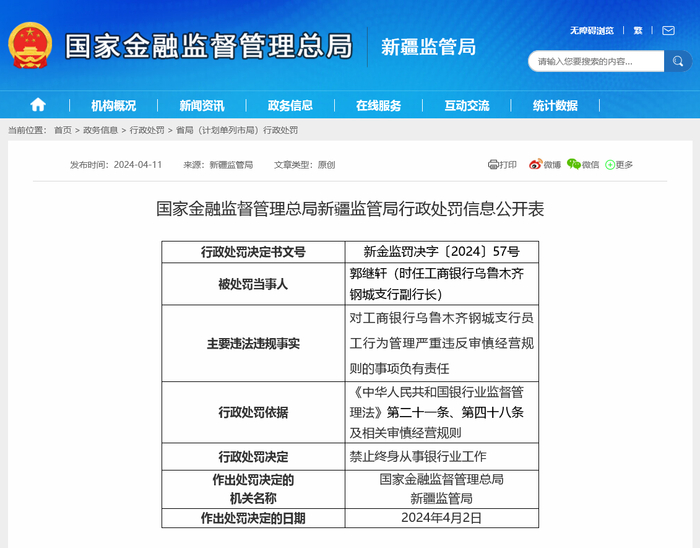 日前,国家金融监督管理总局官网披露,时任工商银行乌鲁木齐钢城支行副行长郭继轩,因为对该行员工行为管理严重违反审慎经营规则的事项负有责任,被终身禁业。
