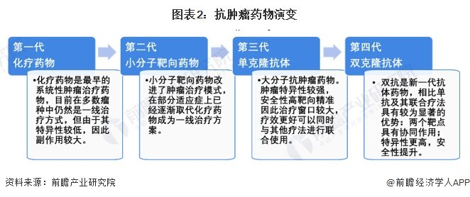 抗肿瘤药物经历了四代演变,治疗已经逐渐精准化。过去肿瘤治疗主要是以化疗药物为主。化疗药物是首种系统性癌症治疗药物,主要通过干扰细胞周期,延缓或彻底阻止肿瘤细胞繁殖。但由于化疗药物也会对正常细胞进行无差别杀伤,因此虽然可以广泛运用但会带来严重的副作用。自2000年以来,以小分子靶向药和抗体为代表的精准疗法的研发取得巨大进步,逐步成为肿瘤主要的治疗方式。