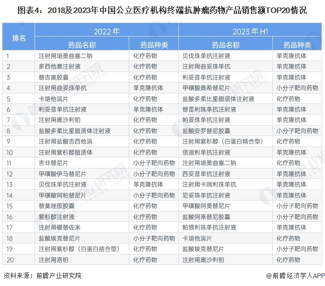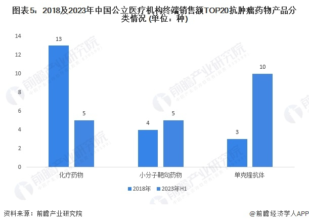 从公立医疗机构终端抗肿瘤药物产品销售额TOP20种类变化情况来看,2018年到2023年上半年,化疗药物从13种下降到5种,小分子靶向药从4种上升到5种,单克隆抗体从3种上升到10种。靶向药物需求呈上涨趋势。