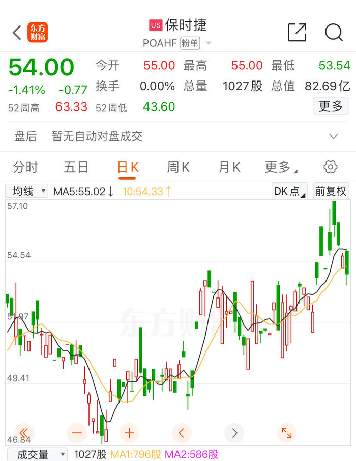 截至上周五收盘数据,保时捷在美国粉单市场报54.00美元,总市值82.69亿美元。