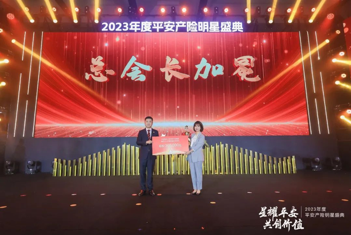 平安产险党委书记、董事长兼CEO龙泉为2023年度平安产险明星会总会长曹虹及5位渠道会长颁奖。在这场盛典中,共计425位明星英雄和74家明星单位的辉煌成就得到了肯定与表彰。