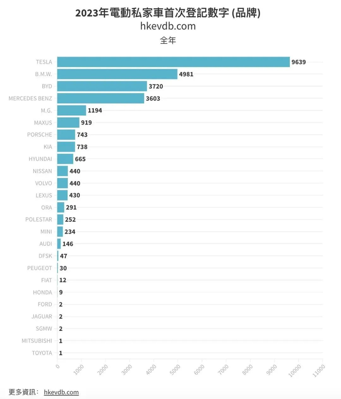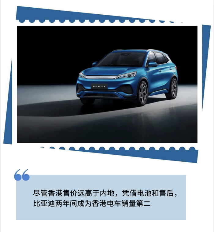 在2023年香港电动私家车的总销量榜单中,比亚迪(3720辆)是第三名,排在特斯拉(9639辆)和宝马(4981辆)之后。