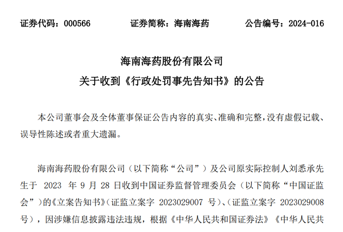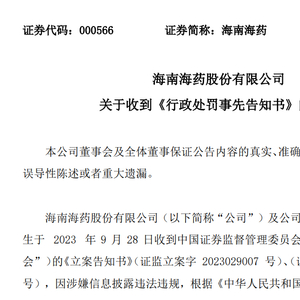 瑞财经 李兰4月12日,海南海药(000566.SZ)发布关于收到《行政处罚事先告知书》的公告。