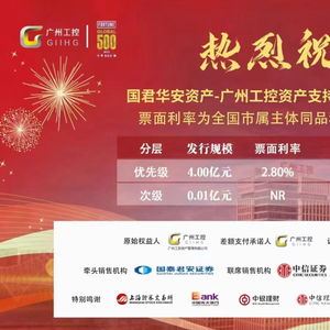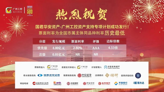 2024年4月11日,广州工控首单商业地产抵押贷款支持证券(CMBS)产品“国君华安资产-广州工控资产支持专项计划”正式设立并成功发行,此次发行规模4.01亿元,优先级资产支持证券规模为4.00亿元,吸引了近20家投资机构参与竞标,全场认购倍数3.39倍,边际倍数近5倍。票面利率最终锁定2.80%,优先级票面利率为全国市属国企同品种利率历史最低。