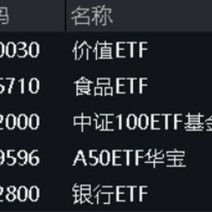 盘面上,中字头大面积飙升,覆盖26只中字头个股的价值ETF(510030)场内价格收涨2.95%;核心资产大涨,核心宽基A50ETF华宝(159596)、中证100ETF基金(562000)场内价格携手涨超2%。白酒股飙涨带动食品饮料板块上行,食品ETF(515710)场内价格收涨2.72%;银行板块亦涨幅居前,银行ETF(512800)场内价格收涨2.07%。