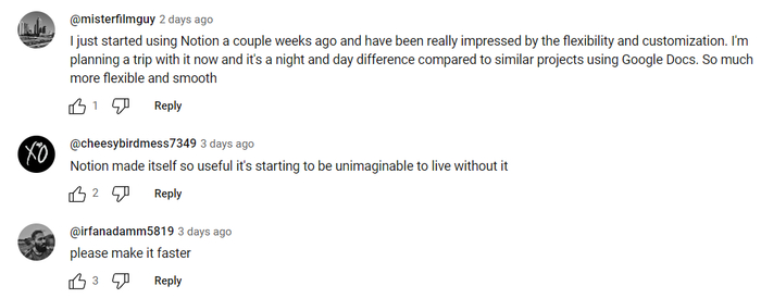 有用户在视频下方评论称:“我几周前才开始使用 Notion,它的灵活性和可定制性给我留下了深刻的印象。我现在正计划带着它去旅行。与使用 Google 文档的类似项目相比,这是天壤之别,更加灵活和流畅。”“Notion变得如此有用,以至于没有它就无法生活。”“请让它更快些。”