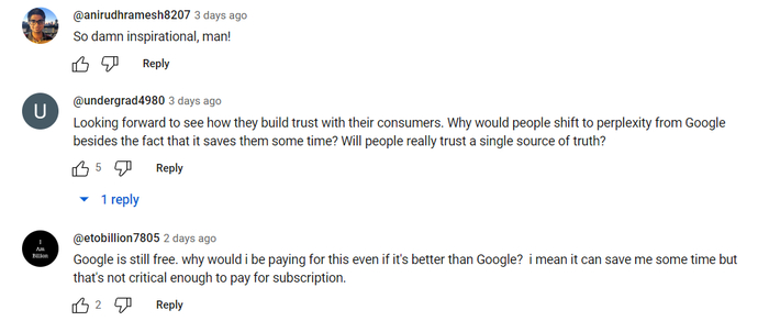 该采访视频下方用户评论道:“太励志了,伙计!”“期待看到他们如何与消费者建立信任。除了谷歌可以节省一些时间之外,为什么人们会从谷歌转向困惑呢?人们真的会相信单一的事实来源吗?”“谷歌仍然是免费的。即使它比谷歌更好,我为什么要为此付费?我的意思是它可以节省我一些时间,但这还不足以支付订阅费用。”