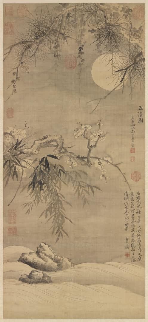 1681年初秋的一天,恽寿平画了一幅《五清图》。“五清”,就是象征君子“清白”品格的五种物象,即画中的松树、竹子、梅花、流水和月亮。画上,一轮硕大的明月,在古松的掩映中发出明亮的清辉,翠竹和白梅在画的中部横逸斜出,画的底部,流水冲过山石的阻挡潺潺流淌。恽寿平在题款上写道:“画有高逸一种,用笔之妙,如虫书鸟迹,无意为佳,所谓遗筌舍筏,离尘境而与天游,清晖憺忘,不可以言传矣。”清气,是恽寿平画作的重要气质。“清”,是洁净无瑕、澄明朗澈。李开先在《中麓画品》中说:“画要清,笔法简俊莹洁,疏豁虚明。笔法要润,含滋蕴彩,生气蔼然。”这正足以形容恽寿平的画风。