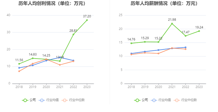 截至2023年末,公司员工总数为2641人,人均创收159.04万元,人均创利37.20万元,人均薪酬19.24万元,较上年同期分别增长10.81%、29.14%、10.18%。