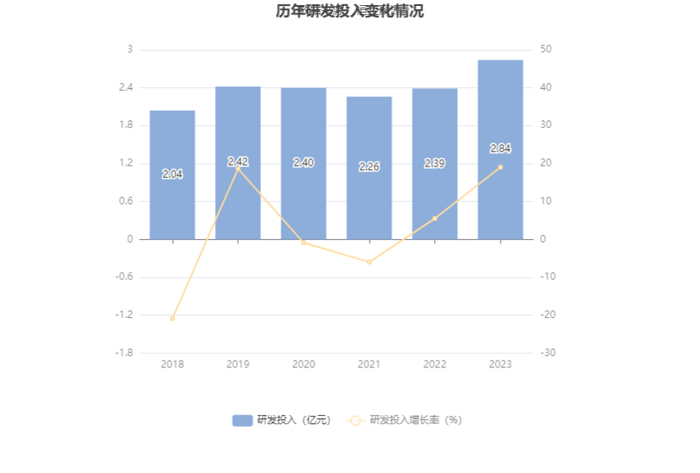 2023年全年,公司研发投入金额为2.84亿元,同比增长19.07%;研发投入占营业收入比例为6.76%,相比上年同期下降0.45个百分点。此外,公司全年研发投入资本化率为0。