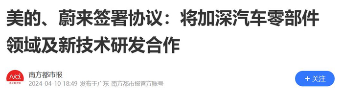 4月10日,有报道称,美的集团与蔚来汽车在美的威灵汽车部件安庆工厂签署战略合作协议,双方将在新能源汽车零部件、自动化、数字化等方面开展合作。