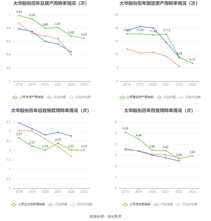 营运能力方面,2023年,公司公司总资产周转率为0.65次,上年同期为0.68次(2022年行业平均值为0.44次,公司位居同行业6/25);固定资产周转率为6.73次,上年同期为8.95次(2022年行业平均值为8.85次,公司位居同行业11/25);公司应收账款周转率、存货周转率分别为2.03次、2.95次。