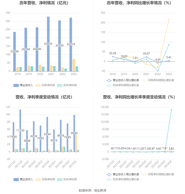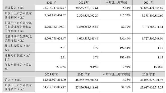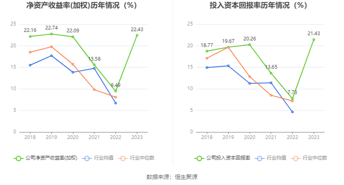 数据显示,2023年公司加权平均净资产收益率为22.43%,较上年同期增长12.94个百分点;公司2023年投入资本回报率为21.43%,较上年同期增长13.70个百分点。