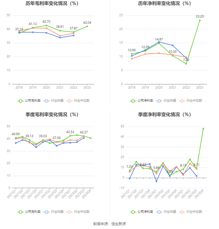 2023年,公司毛利率为42.04%,同比上升4.17个百分点;净利率为23.20%,较上年同期上升15.80个百分点。从单季度指标来看,2023年第四季度公司毛利率为40.66%,同比上升2.01个百分点,环比下降1.61个百分点;净利率为47.98%,较上年同期上升42.06个百分点,较上一季度上升39.27个百分点。