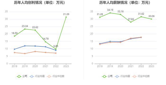 截至2023年末,公司员工总数为23452人,人均创收137.38万元,人均创利31.39万元,人均薪酬30.06万元,较上年同期分别变化6.01%、218.55%、-4.95%。