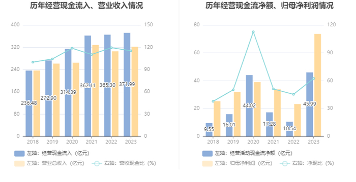 2023年,公司经营活动现金流净额为45.99亿元,同比增长336.49%;筹资活动现金流净额16.53亿元,同比增加19.97亿元;投资活动现金流净额17.26亿元,上年同期为-6.0亿元。