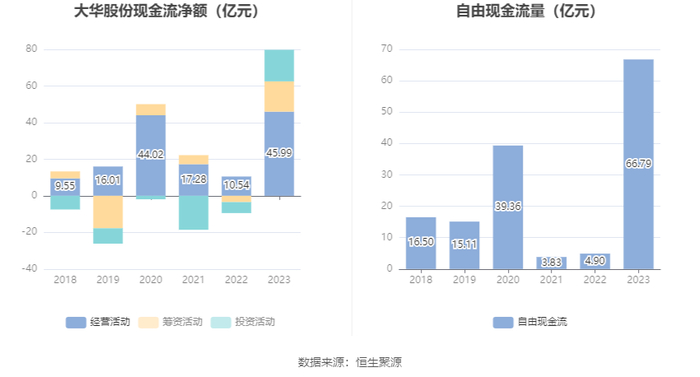 进一步统计发现,2023年公司自由现金流为66.79亿元,相比上年同期增长1262.56%。