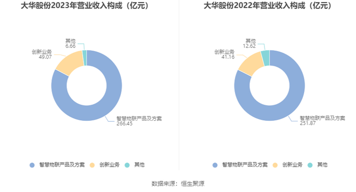 分产品来看,2023年公司主营业务中,智慧物联产品及方案收入266.45亿元,同比增长5.79%,占营业收入的82.70%;创新业务收入49.07亿元,同比增长19.20%,占营业收入的15.23%。
