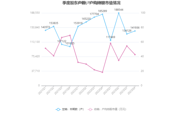 筹码集中度方面,截至2023年年末,公司股东总户数为14.19万户,较三季度末增长了7810户,增幅5.82%;户均持股市值由三季度末的54.70万元下降至42.82万元,降幅为21.72%。