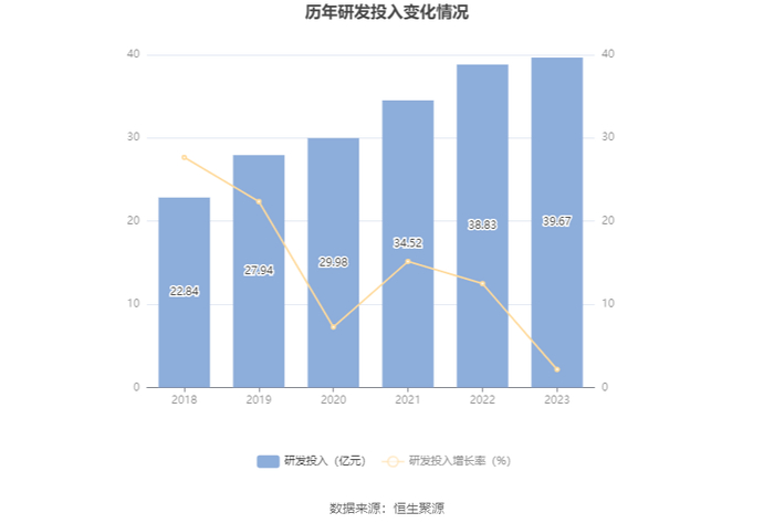 2023年全年,公司研发投入金额为39.67亿元,同比增长2.17%;研发投入占营业收入比例为12.31%,相比上年同期下降0.39个百分点。此外,公司全年研发投入资本化率为0。