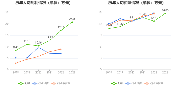 截至2023年末,公司员工总数为4035人,人均创收134.81万元,人均创利20.95万元,人均薪酬14.85万元,较上年同期分别增长16.96%、21.86%、16.22%。