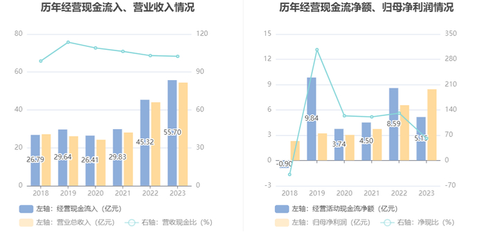 2023年,公司经营活动现金流净额为5.15亿元,同比下降40.01%;筹资活动现金流净额3776.57万元,同比增加2.72亿元;投资活动现金流净额-8.65亿元,上年同期为6.26亿元。