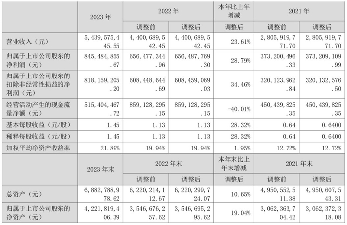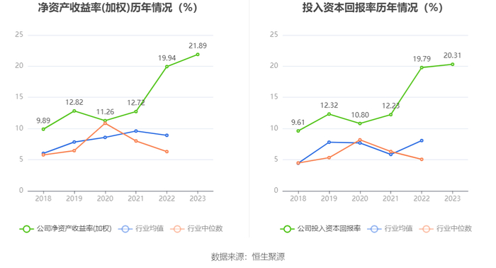 数据显示,2023年公司加权平均净资产收益率为21.89%,较上年同期增长1.95个百分点;公司2023年投入资本回报率为20.31%,较上年同期增长0.52个百分点。