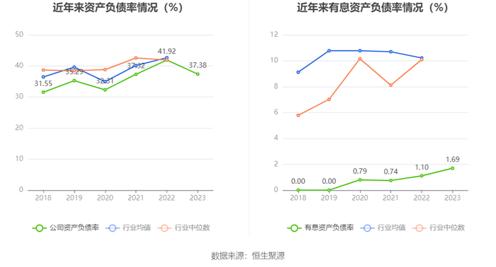 在偿债能力方面,公司2023年年末资产负债率为37.38%,相比上年末下降4.54个百分点;有息资产负债率为1.69%,相比上年末上升0.59个百分点。