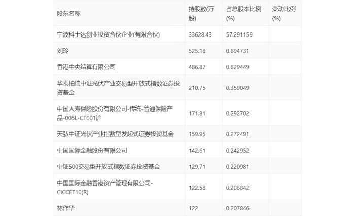 年报显示,2023年年末公司十大流通股东中,新进股东为中国国际金融香港资产管理有限公司-CICCFT10(R)、林作华,取代了三季度末的中国人寿保险股份有限公司-传统-普通保险产品-005L-CT001沪、建信中证500指数增强型证券投资基金、中国工商银行股份有限公司-汇添富中证新能源汽车产业指数型发起式证券投资基金(LOF)、中信证券股份有限公司。在具体持股比例上,香港中央结算有限公司、华泰柏瑞中证光伏产业交易型开放式指数证券投资基金、天弘中证光伏产业指数型发起式证券投资基金、中证500交易型开放式指数证券投资基金持股有所下降。